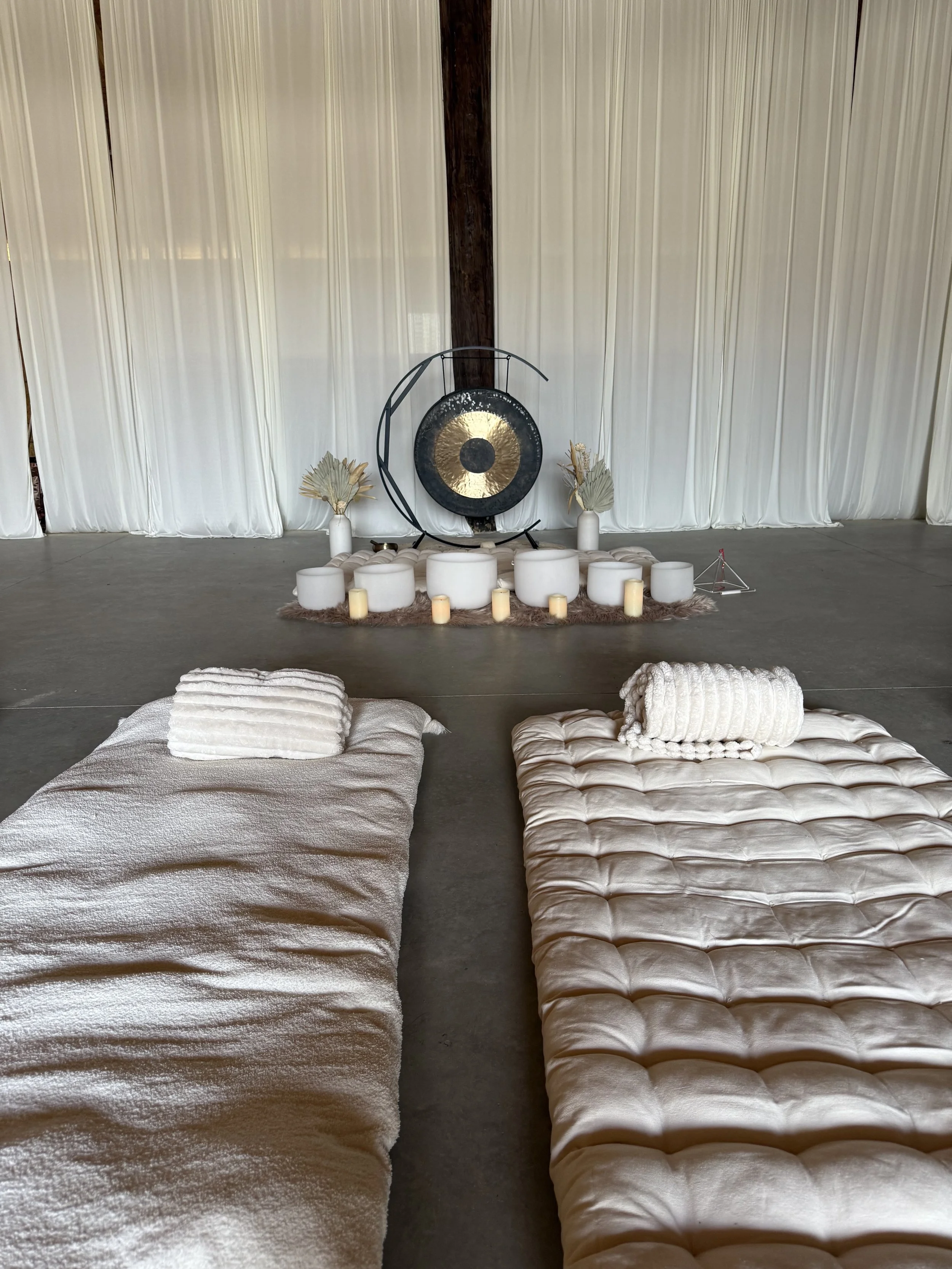 A sound bath is a restorative, nervous-system-supporting experience designed to help you slow down, release tension, and reconnect with your body. We begin with grounding breath and gentle guidance to help you arrive fully in the moment, followed by immersive tones from crystal singing bowls, chimes, and intuitive sound instruments that encourage deep relaxation and emotional softening.